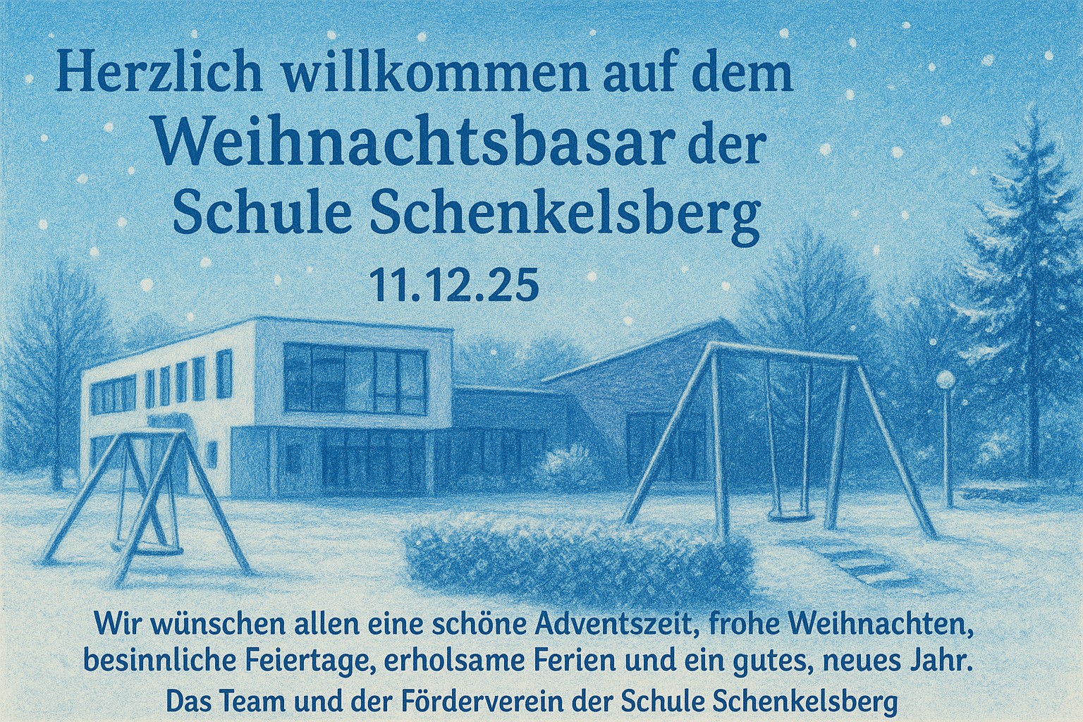 Am 11.12.2025 fand an der Schule Schenkelsberg ein Weihnachtsbasar statt und die Schule erstrahlte von 14.30 Uhr bis 16.30 Uhr in vorweihnachtlichem Glanz. Die Kinder hatten in der Aula und im Flur des Neubaus liebevoll dekorierte Verkaufsstände aufgebaut. Jede Klasse präsentierte und verkaufte ihre hergestellten Produkte, die in einer zuvor durchgeführten Bastelwoche mit viel Kreativität und Begeisterung entstanden waren.