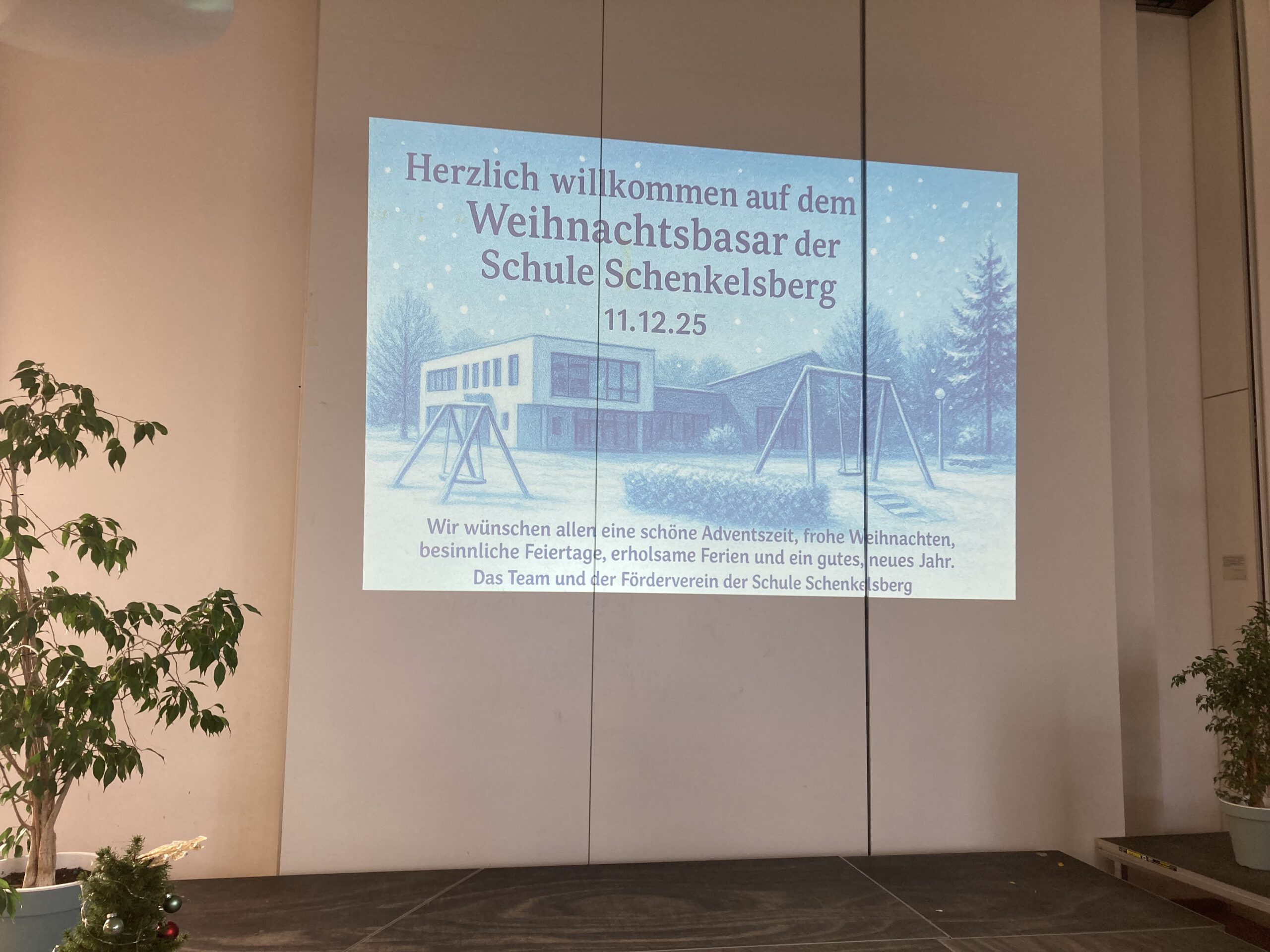 Am 11.12.2025 fand an der Schule Schenkelsberg ein Weihnachtsbasar statt und die Schule erstrahlte von 14.30 Uhr bis 16.30 Uhr in vorweihnachtlichem Glanz. Die Kinder hatten in der Aula und im Flur des Neubaus liebevoll dekorierte Verkaufsstände aufgebaut. Jede Klasse präsentierte und verkaufte ihre hergestellten Produkte, die in einer zuvor durchgeführten Bastelwoche mit viel Kreativität und Begeisterung entstanden waren.